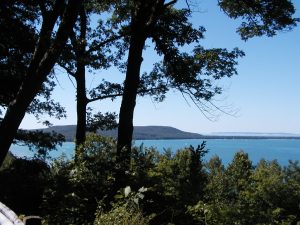 As we approached M-22 again, Jay laid out the options. Turning left would take us on a nice flat road back to Glen Arbor; right would climb up the Big Glen Lake hill to Inspiration Point and then back around the lake. He told me it was my call. Logic said left, manhood preservation took me right (*). And not only did I make it up the hill on my tired legs, I led the group. It helped that Jay had trouble with his shifter, but the view from the Point wasn’t any less sweet for that.