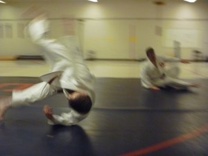 My other “mat activity,” evening Rec & Ed Aikido, had its first class of 2012 tonight. I added to the challenge by arriving late, which meant 30 pushups before I could join the class. But I knocked them off quickly in one set, whereas at home I’ve only been able to do 25 before needing a break. For some reason I do better with these in public; last month I did 30 consecutive pushups in a suit and tie with many of my friends watching. (Don’t ask me where I was, because it was totally inappropriate to the occasion.) Since I needed 50 pushups today anyway, it was fine. I’d have only 20 left to do after class.
