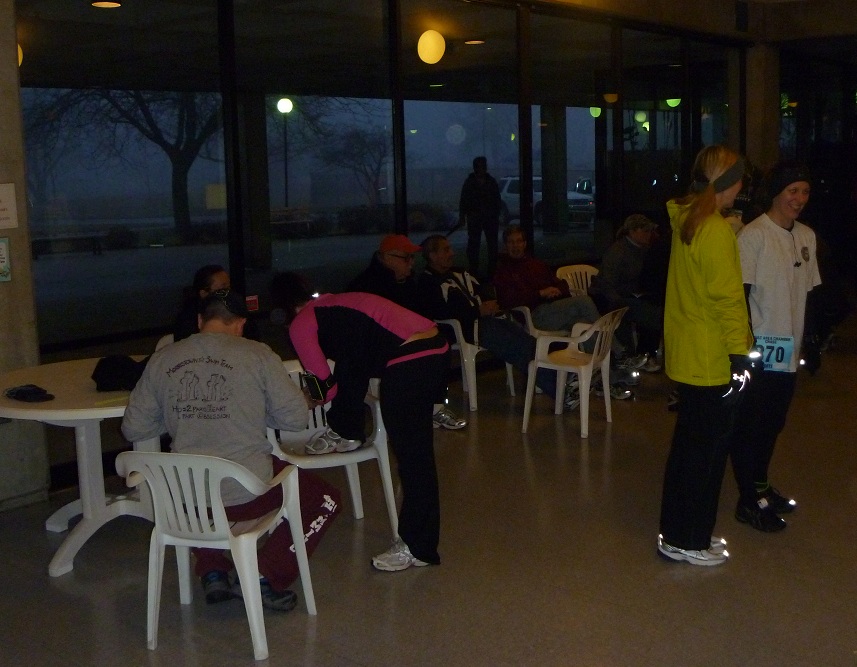 I left work early (gee, what a shame) and arrived about an hour before the 6:30 p.m. race start, before most of the crowd showed up. Short lines for packet pickup and the restrooms – what a treat! I also had time for some warmup sprints, and although it was a bit rainy (“a heavy dew” was the euphemism used by the race organizer) I switched out of my rain/wind jacket, thinking I would be plenty warm once I got running. I was right.