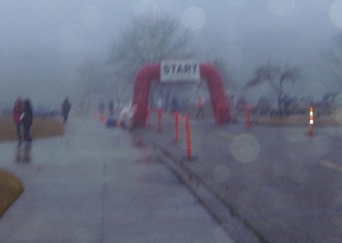 I’d discussed strategy with Coach Marie on Saturday, and told her my goal of beating 28:00. She liked my plan to start a bit slower than my 5K race pace, then give it whatever I had left the final mile. I lined up in the front ranks and got off to a clear start, and away we sprinted into the deepening mist, a truck with a flashing light leading the way. About a quarter mile in I checked my watch; a 6:18 pace – too fast. So I eased back to my planned pace of 6:50. (I still can’t believe I’m writing, “slowed down to 6:50” to describe myself in a race.) I was amazed to find myself up in the front pack, and while the fastest runners eventually pulled away, very few came up from behind to catch me. Instead, I was overtaking people ahead of me! Near mile 3 the route had a turnaround point, and I started counting the people who passed me going the other way; there weren’t many. After 3 miles I started to flag, but I held onto a pace around 7:05 or so until the finish.