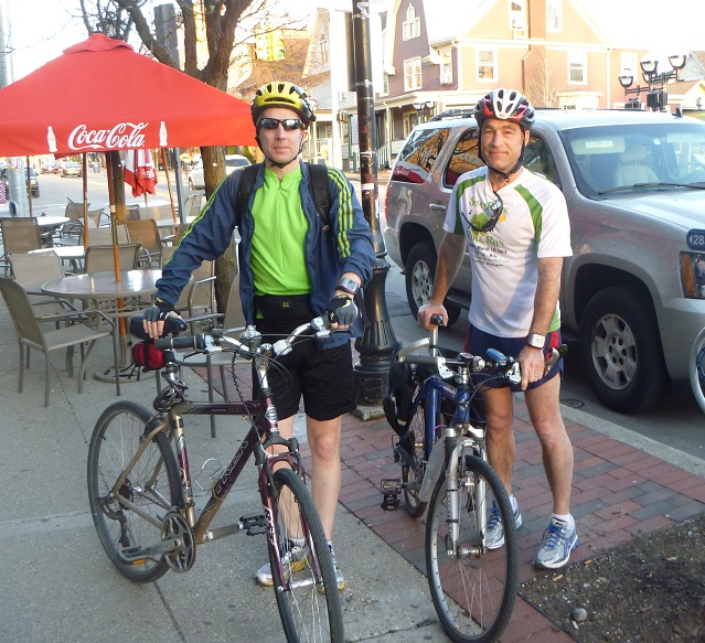 I got in the bike ride by using the Trek to get me from home to my run and back home afterward. At around 10 miles round trip, the trip downtown was a good warmup, and the return ride kept my legs loose following the hard run. And I wasn’t alone in this strategy; at least two others in our group rode their bikes to PR Fitness tonight. The picture shows me with Bob, who rides his bike to every Wednesday evening and Saturday morning run, even in the rain and snow. You’re a better man than I am, Gunga Bob!