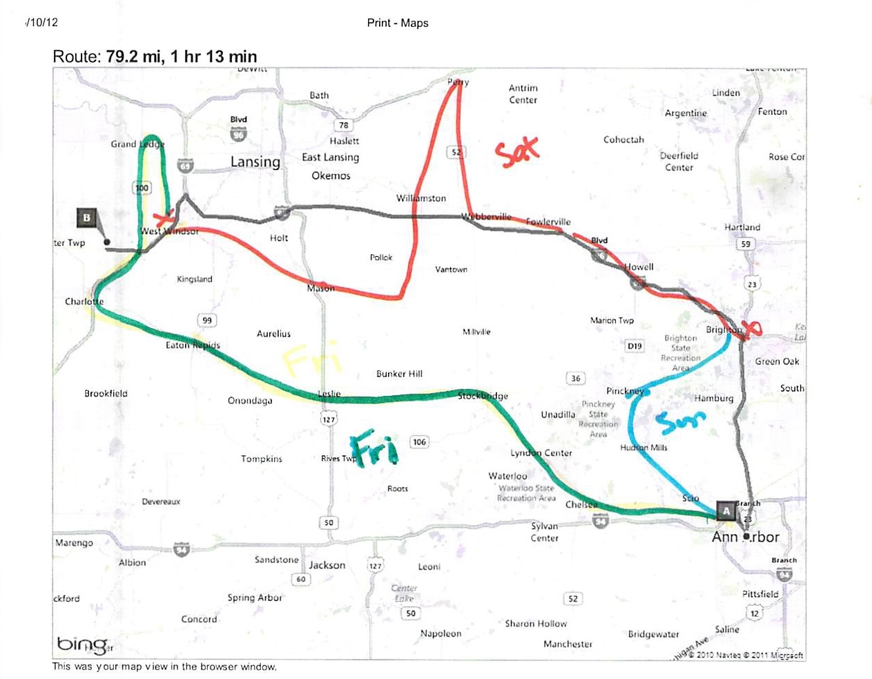 - Saturday: 72 miles, 7 towns (Dimondale, Mason, Dansville, Williamston, Webberville, Fowlerville, Howell)