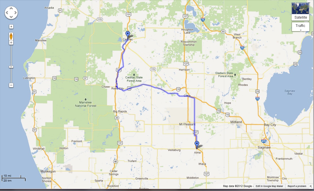 The trip begins with a familiar route to Chelsea, Stockbridge and Mason, all towns I visited in May, and from there through Lansing, St. Johns, and Ithaca on the way to Alma.