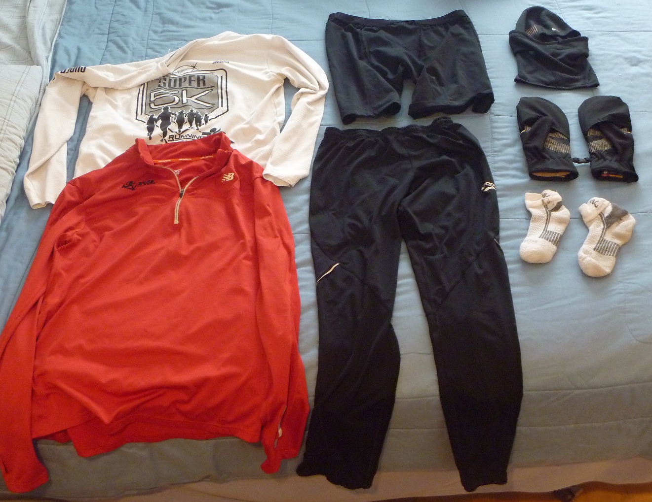 Winter Outfit - HeavierBy contrast, this outfit was what I wore yesterday morning. Still two layers, but the base layer was long sleeve and the top shirt is a “thermal” – thicker, with a tighter weave. On top was the yellow jacket, which has an extra lining to keep out more wind and rain. (It’s also a good all-season cycling jacket.) This combination works down into the single digits for me. In fact, the red shirt is so warm that many runners in our group don’t use a jacket with it. The headgear is a balaclava, which can be worn in many configurations from hat-like to covering the entire face. Also note the thicker socks.