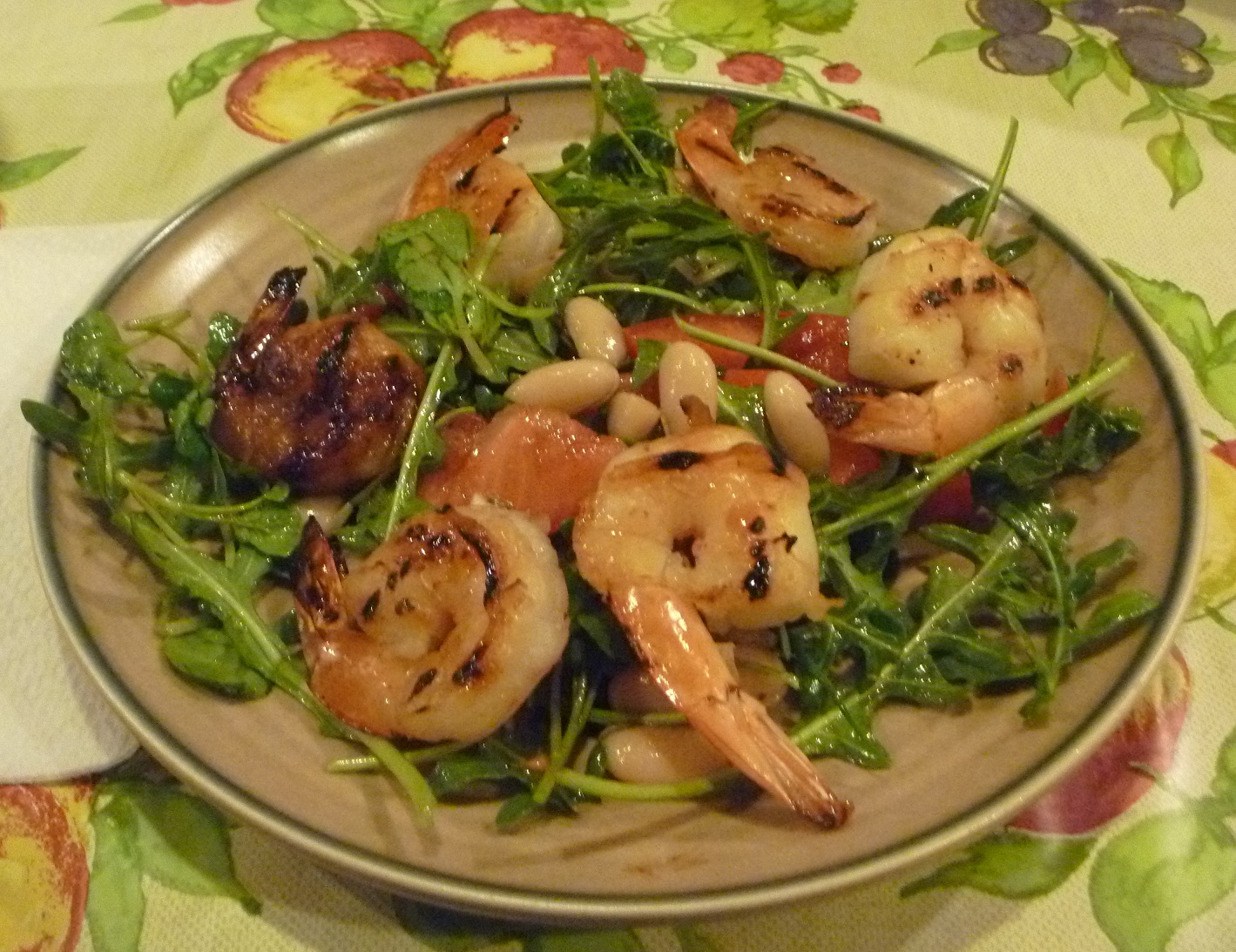 The greens here are great choices – the arugula looks good with the shrimp, and the watercress adds a great mild peppery bite. I used champagne vinegar in place of the sherry vinegar, and chopped Roma tomatoes instead of grape tomatoes. I was surprised that the shrimp was seasoned only with some diluted honey and a bit of salt, but they grilled up with great color and flavor. I think the key was to use good quality fresh shrimp, and not the frozen stuff, which gets rubbery very fast.