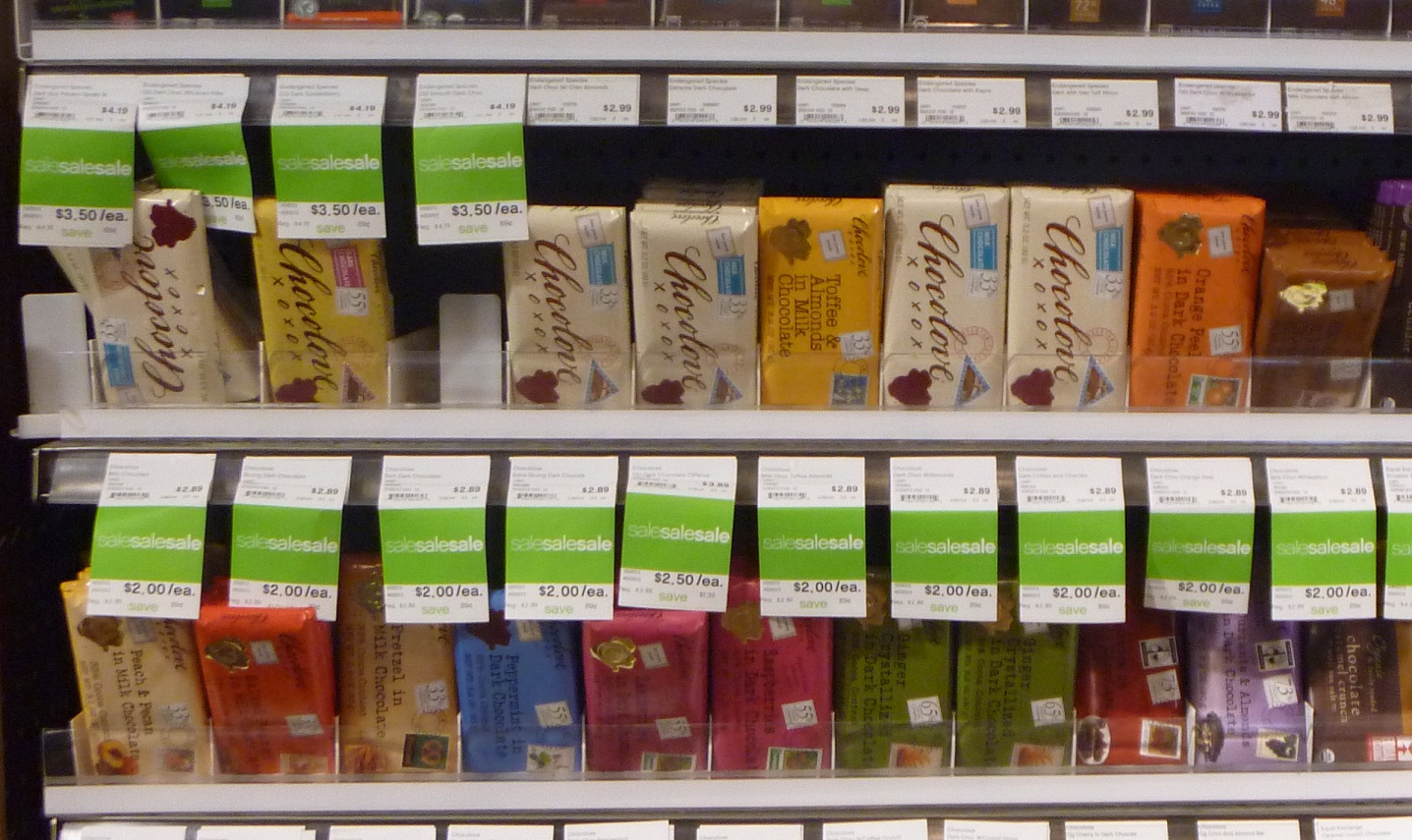 The wrapper has a pleasing color, but it seems a bit too busy, especially in contrast with the elegantly understated Pralus Sao Tome bar from our previous review. To me, it’s trying a little too hard to get my attention, with the gold seal, stamps, and various illustrations. However, when all the Chocolove offerings are grouped in the display (middle two rows below), they really stand out. So what do I know?