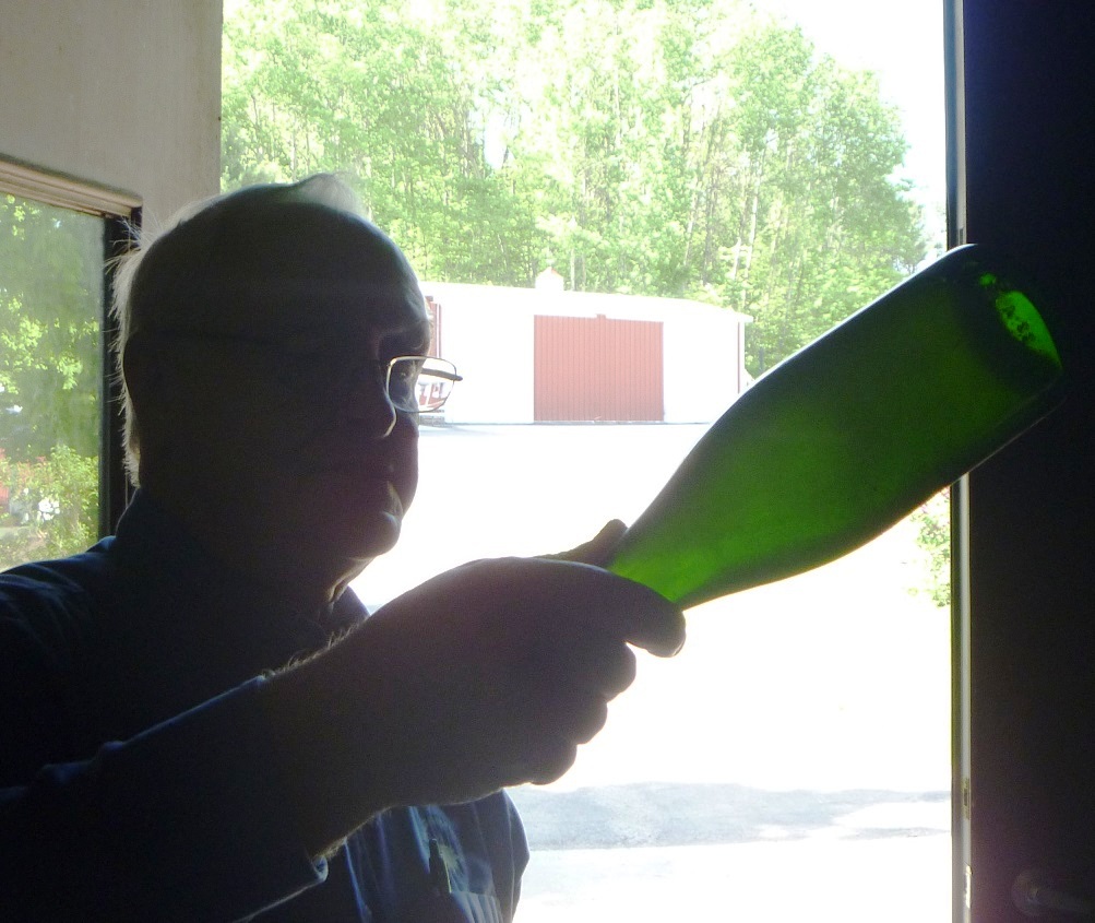The residue of yeast and grape solids is removed from sparkling wine in a multi-step process that preserves the carbonation. The bottles are set at an angle with the top pointed down, and rotated a quarter turn each day, so the solids settle in the neck of the bottle. Then the necks are cooled to freeze the plugs. The bottle is uncapped and the pressure shoots the plug out of the bottle, which is then quickly corked.