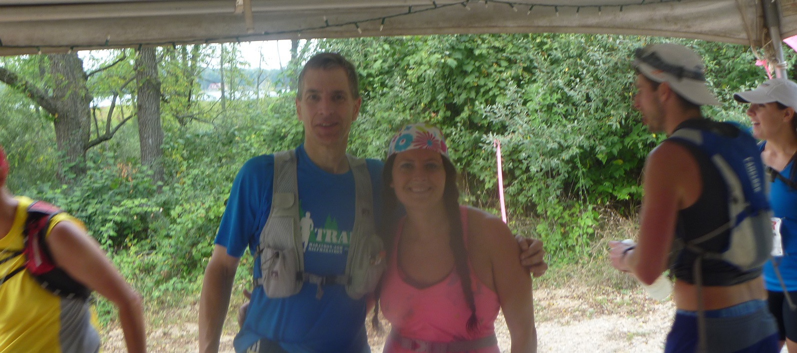 One fellow 50-miler named Carolyn both inspired and confounded me all during the race. I met her a couple of miles in, and learned that she’d run a double marathon earlier in the year. I ran ahead, but she caught up at the aid station and went ahead until near the halfway point where, again, we met at the aid station (see photo). At that point I picked up the pace, and figured I’d seen the last of her. And so it proved – until the final aid station at mile 45. As I walked away, finishing my drink, she motored on past me. “Oh, hi!” she said, before disappearing into the woods.