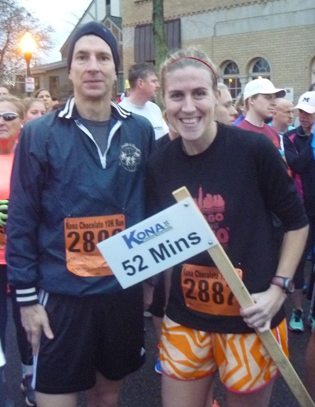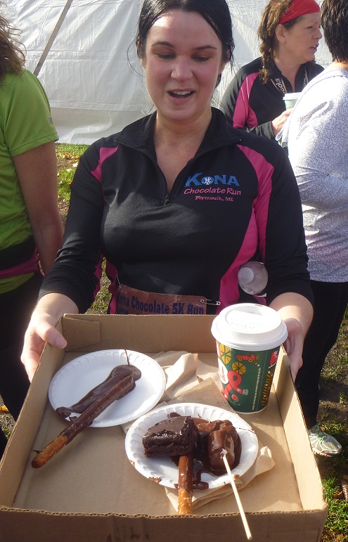Oh, and how about this? According to the race results, Eric Stuber, age 50, finished the 10K in 35:25 (a 5:43 per mile pace). Not only did he win his age group, he finished first overall. That’s right – a 50-year-old won the 10K. Such is the power of chocolate.