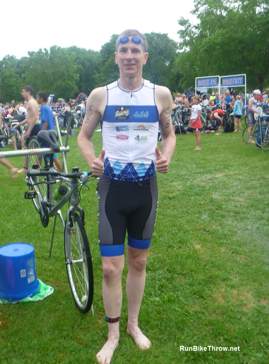 Most sprinters finish in 90 minutes or less, which means one can be squeezed into a weekday evening, as this one was. If  there was going to be a race, that is: a nasty thunderstorm knocked out power at home Wednesday morning, and the weather radar promised another set that afternoon. Fortunately, they’d come and gone by 5:00, so our 6:00 start had a comfortable water temperature (77 degrees) and air temps in the 60s, perfect for the bike and run.