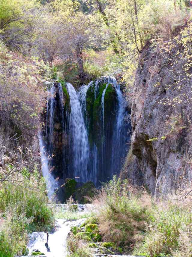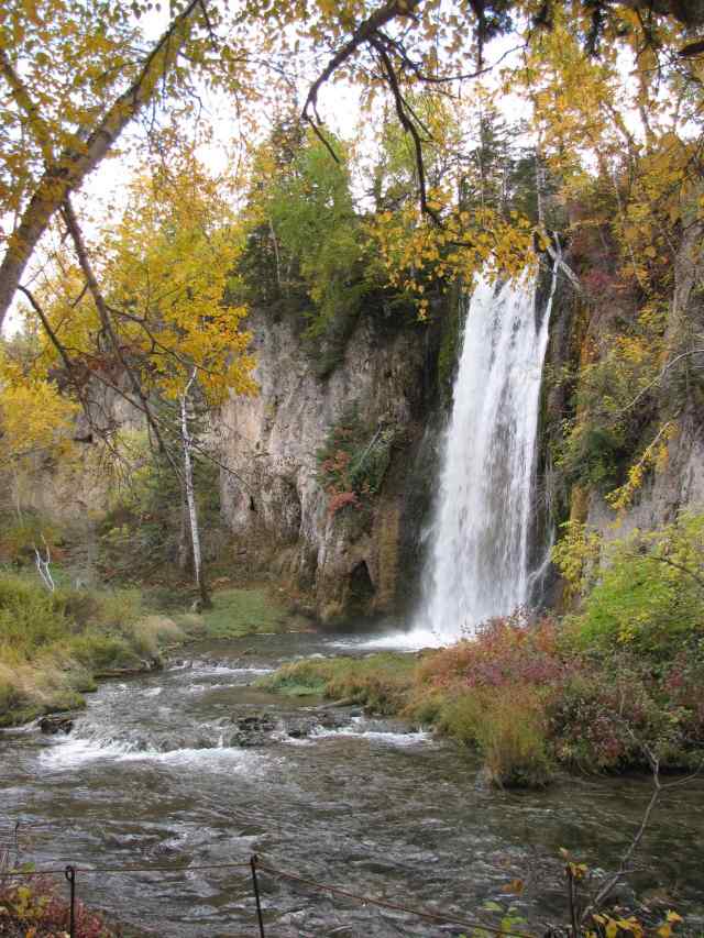 I returned to the car [and] instead of taking the hint, I walked the short distance to the other trailhead. Gee, it is only 3/4 mile round trip to the base of Spearfish Falls. How hard could that be? That was answered by a series of steeply descending switchbacks, followed by a walk through tall pine trees to the base of the falls. It was definitely worth it as the falls were surrounded by a riot of color from fall foliage, making a near perfect picture suitable for a postcard. I hope the image shows this.