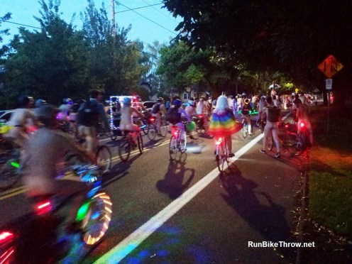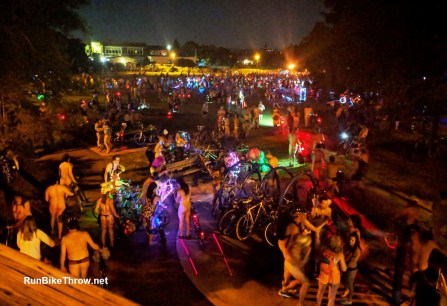 A: It changes every year, and they keep it a secret for obvious reasons (except to the police, of course). This year we went through North Portland, mostly through residential neighborhoods, with some bars or retail here and there. We ended up at Woodlawn Park, and from there people hung out (sorry) or dispersed to the after-parties.