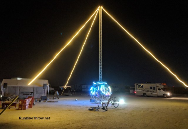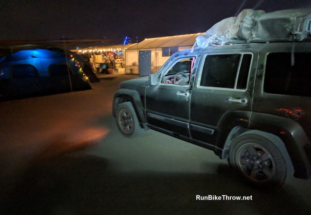 Uh-huh. It’s dark, I’m tired and hungry, and I have no freaking idea where I’m going. I drive off slowly and decide to follow a car ahead of me off to the right. Slowly shapes appear – tents and camps lined along curving roads. I drive around for awhile, not sure what I’m looking for, but eventually see empty space next to a large camp. The folks there tell me I’m good.