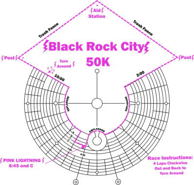 From Pink Lightning the course runs clockwise along the Esplanade, which separates BRC from the “deep playa” containing The Man, the Temple, and the other major sculptures. Out to and along the trash fence, with an aid station at its “peak” (top of the route map). Then down the other side and back along the Esplanade and return to Pink Lightning.