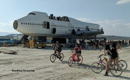 Loop two: I catch up to a guy wearing some really unusual shoes. Under the soles are metal bands acting as springs. Along with the bouncing stride, they add about four inches to his height. He tells me they’re “rebound shoes” with the springs providing a large energy return, and that he likes them a lot. He’s not sure if they’re “race legal,” but hell, this is Burning Man, so who cares?
