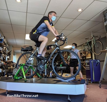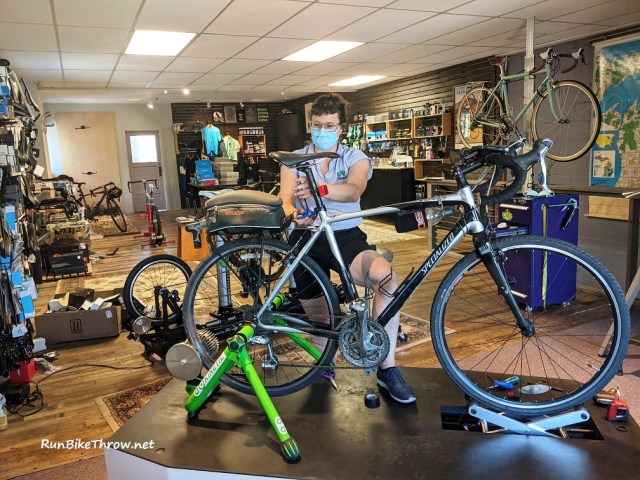 Because I had an appointment to have this fit, after all. An appointment for a professional bike fitting, through Fitmi in Ann Arbor on the second floor of the Sic Transit bike shop. Fittings are private, and by appointment only, both to minimize distractions and for obvious safety reasons these days.