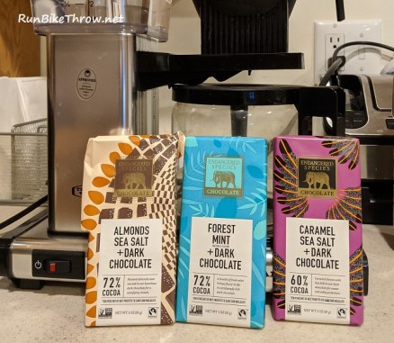 The chocolate? Just about any good brand will do, but my current drug of choice is Endangered Species bars. Heavens, they’re tasty. And ten percent of net profits go to save wildlife, so I’m being socially responsible too. Win-win, if you ask me.