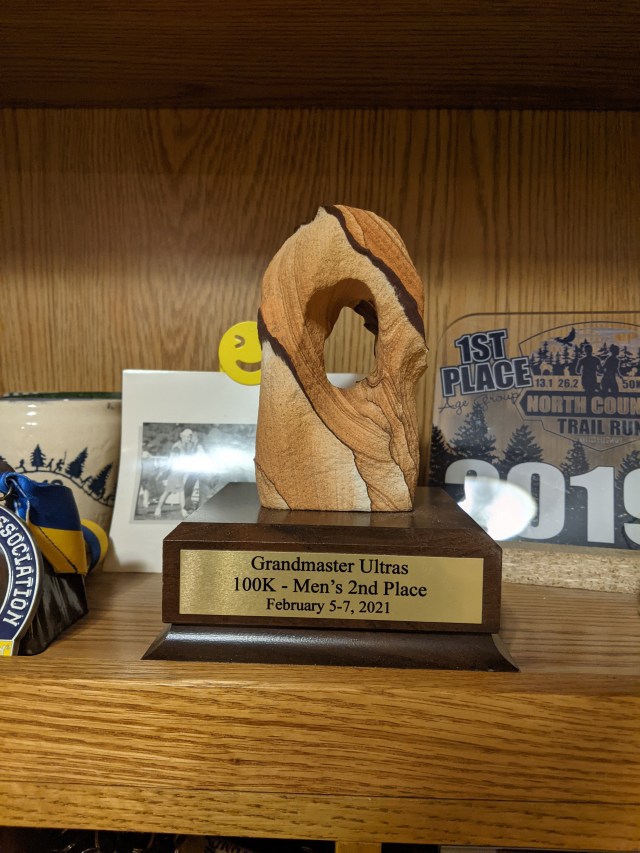 And how do I feel about it now? Just fine, thank you. One advantage of being over fifty is learning what’s worth getting upset over, and what isn’t. And a race result is a definite isn’t. Besides, it makes for a good story. And I like the trophy. People think it’s pretty cool. What was I going to do with another belt?