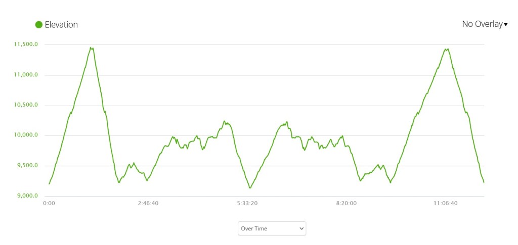 One can run up to 200 miles at this five-day event (and a few did), but we settled on the Friday 50-miler. 10,000 feet of elevation gain at an average altitude of 9,800 feet. Below is the elevation profile, including the climbs to Music Pass (11,450 ft.) to kick off and end every race. Crazy? Sadistic? Well, as the race director pointed out, we signed up for it, so no complaining.