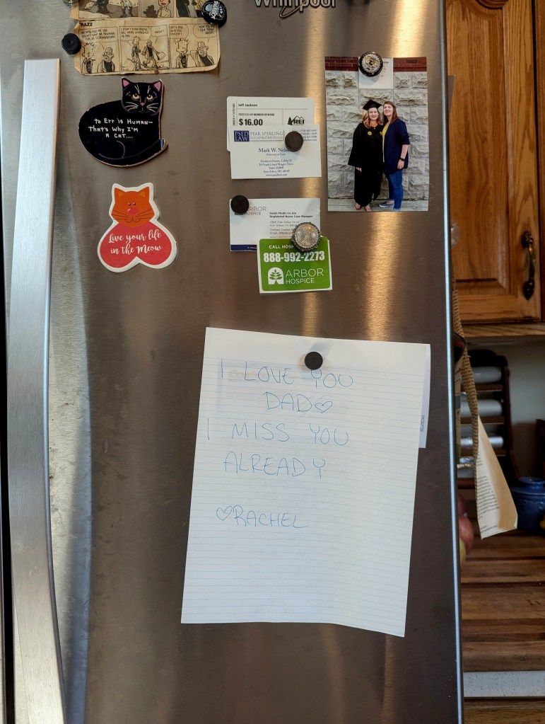 True, it still feels like Joyce is just away for a while, like when she’d go to our campground up north for the weekend while I worked a race. And there are still automatic triggers in my mind. Like when I walk by the flower station at Whole Foods and reflexively wonder if I should get some for her. And Rachel left this sign on the fridge when she left, and my reaction was, “Oh, I can’t wait to show this to Joyce.”