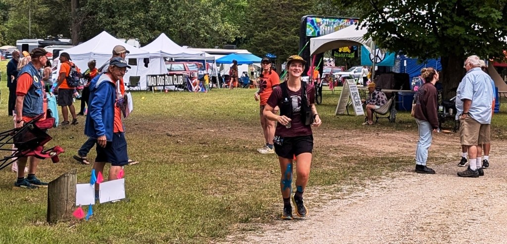 We got back to Hog Farm around 1 a.m. Her gut pain had not fully resolved, but she was revived enough to remove any doubt about going out for her final loop. She rested a few minutes, then off she went. Still wired, I sorted waste at the aid station awhile then caught a couple hours sleep before the Saturday morning shift.