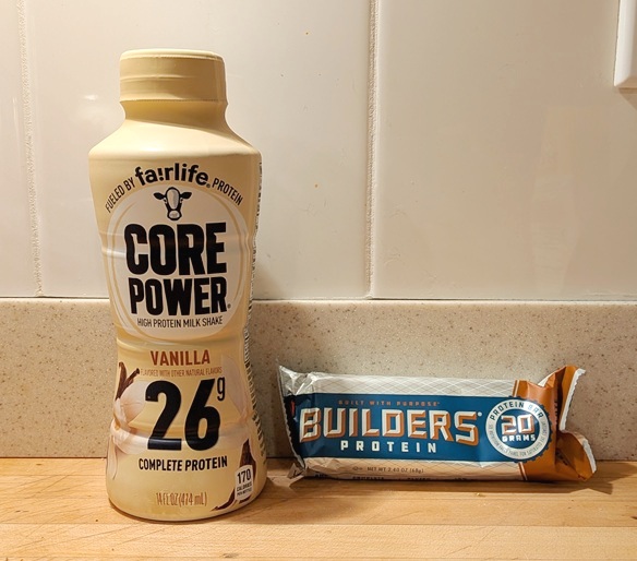 One each per day gets me there, or close enough. However, to reduce the added sugar but keep their drinks and bars tasty, a number of brands use sugar alcohols for sweetness. And I found out that sugar alcohols give me bloating and gas. So I switched to fairlife Core Power for a protein drink and Clif Builder bars, which don’t use them. They add a bit more sugar and saturated fat, but the digestive issue is gone.